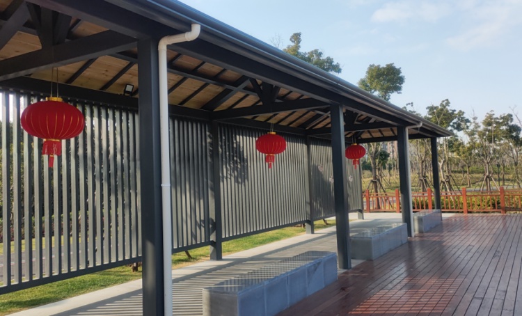 公园借梅花造型于道路铺装、座凳小品、围墙景窗之中,充分体现梅花特色,营造“江都车马满斜晖,争赴城南未掩扉,要识梅花无尽藏,人人襟袖带香归”的氛围。