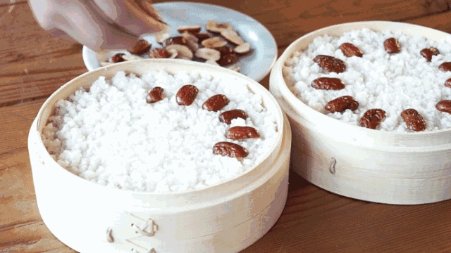 桶蒸糕由大米和糯米混合磨粉制成
