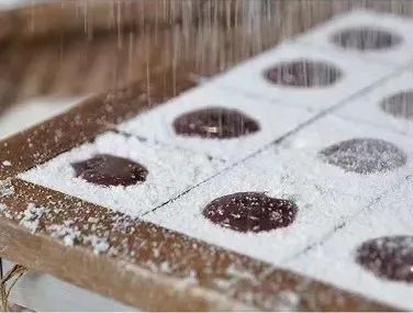 接着将筛好的糕粉洒入模具中