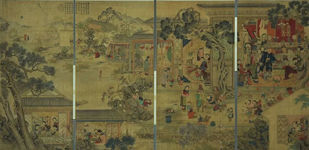 但如果想更进一步,沉浸式领略别有一番“年”味的景象,朱鼎新笔下的《新年景图轴屏》可谓氛围感满满。轴屏由四幅组画构成,从右往左,不同图景中的人纵享着不同的新年乐趣:有姊妹添烛西窗,“笑声转、新年莺语”;有兄弟登高望远,“山家除夕无他事,插了梅花便过年”;还有孩童嬉闹,“儿童强不睡,相守夜欢哗”。