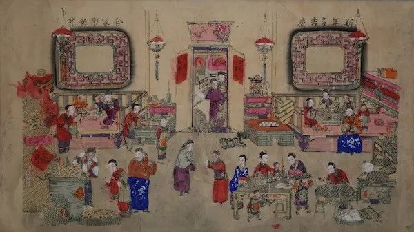在杨柳青的年画《新年多吉庆 合家乐安然》中,理想化的色彩渲染了农耕文明中普通民众的幸福生活。室内华灯吊顶,大门左右分别有两座火炕,两拨人正在用膳和游戏,炉灶里烹饪着佳肴。前景正中是互道吉祥的两位青年;左边高低不一的筐里堆满了钱财宝物,人们驻足围观;右边的妇女孩童正忙着擀面包饺子,簸箕里盛满了节日的食材。整个画面以传统的散点透视法再现了北方人家新年夜其乐融融的家庭生活,人物刻画生动形象,色彩浓淡相宜,富丽典雅。