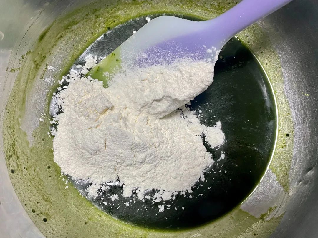 7.将蛋糕面糊从高处倒入铺了油布的烤盘中,用刮刀刮平。