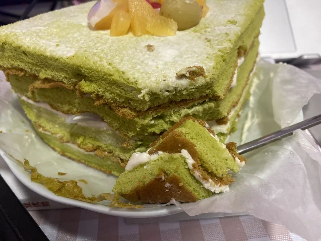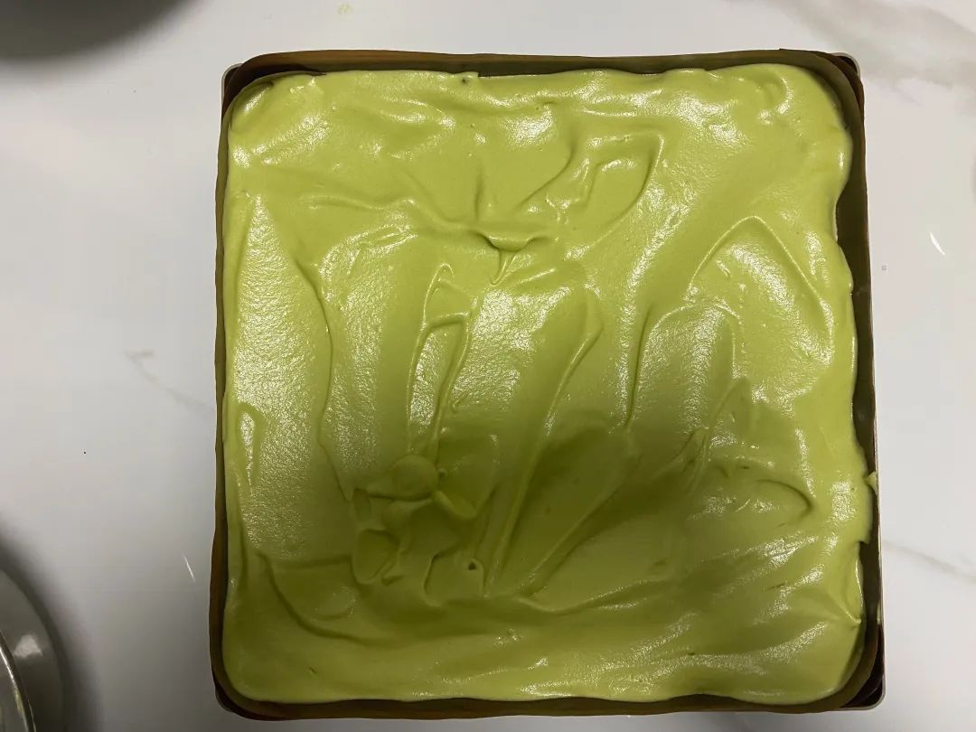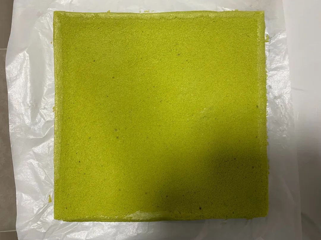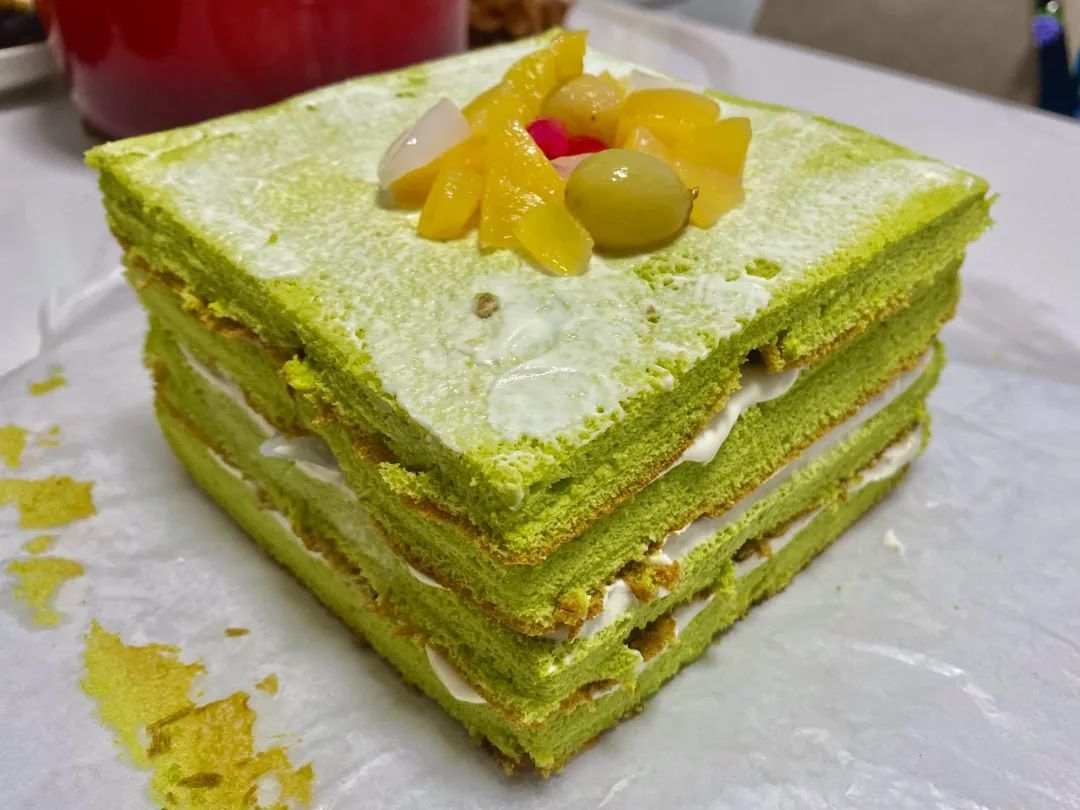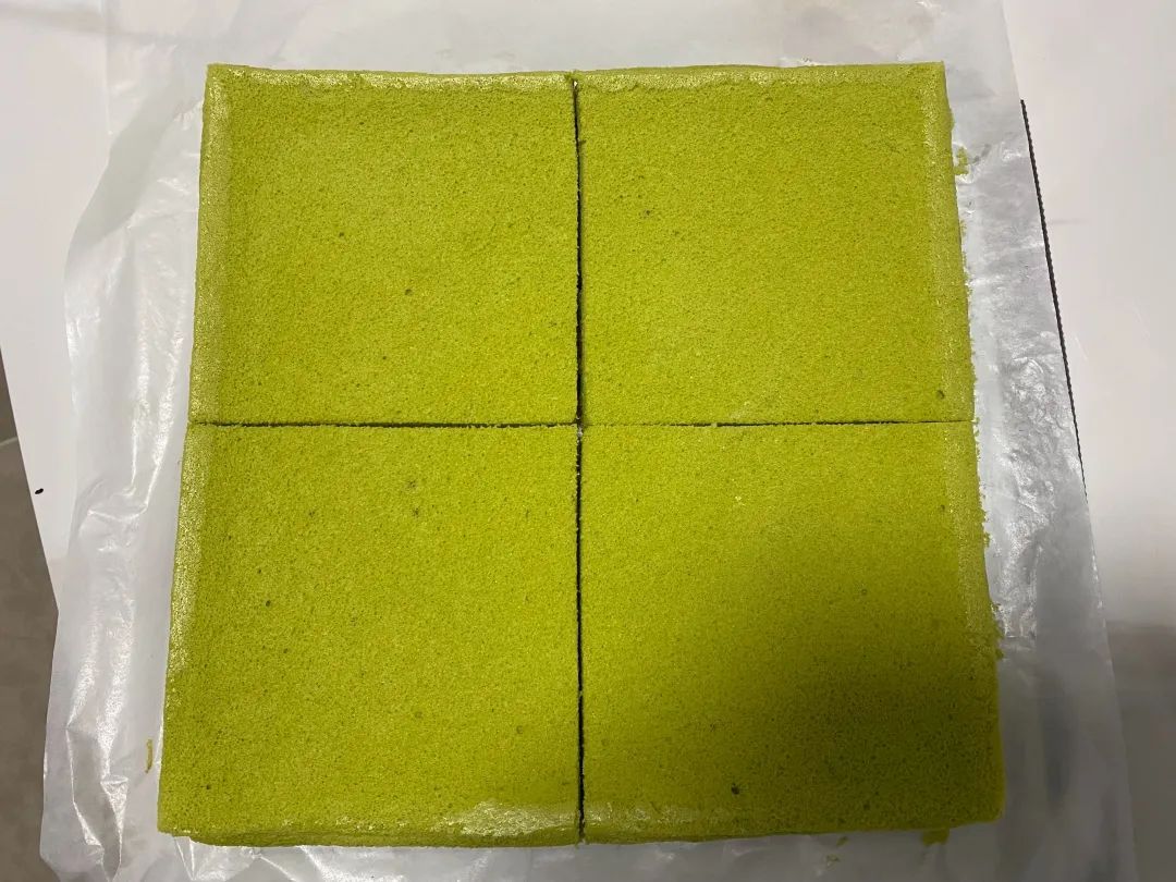 12.重复上一步的操作。修去边角。一个充满东南亚风情的斑斓椰香裸蛋糕就完成啦。
