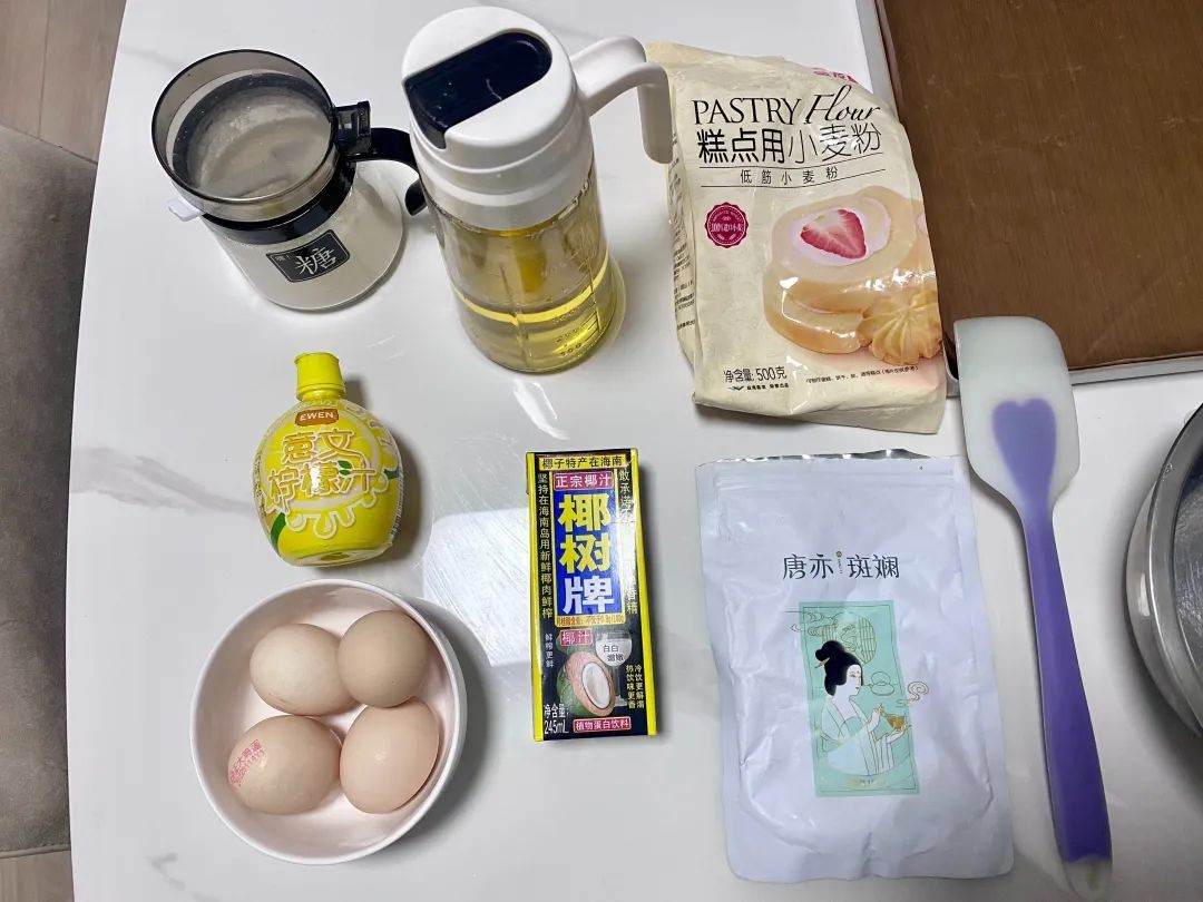材料:4个鸡蛋、椰奶47毫升、斑斓粉7克、低筋面粉40克、植物油40克、白砂糖40克g、柠檬汁少许、淡奶油150毫升、椰子粉10克。
