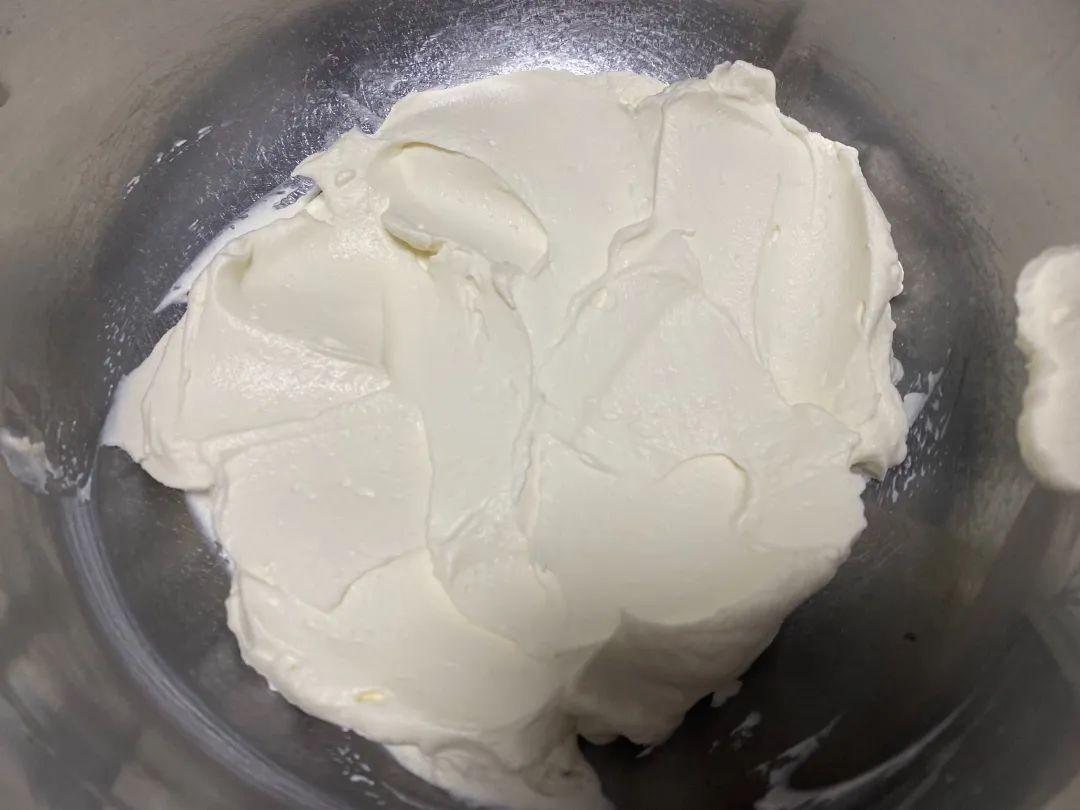 9.趁烘烤的时间打发夹馅的椰子风味奶油。将糖、椰子粉、奶油倒入盆中,打蛋器高速打发至九分发。