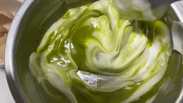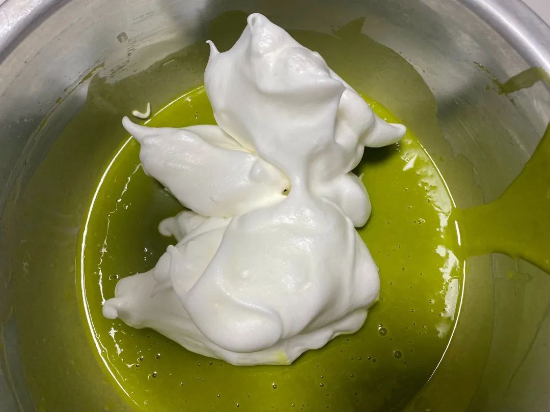 6.将打发好的蛋白取三分之一加入准备好的蛋黄糊中。由下至上抄底拌匀。然后加入剩下的蛋白拌匀。