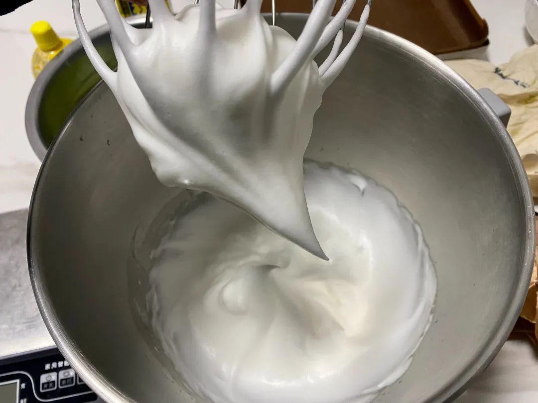 5.蛋清中加入白砂糖和柠檬汁,打蛋器高速打发至呈大弯钩状态。