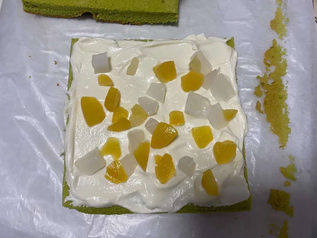 11.将蛋糕片均分四份。取出一片抹上椰子奶油,可以按照个人喜好放上水果丁。