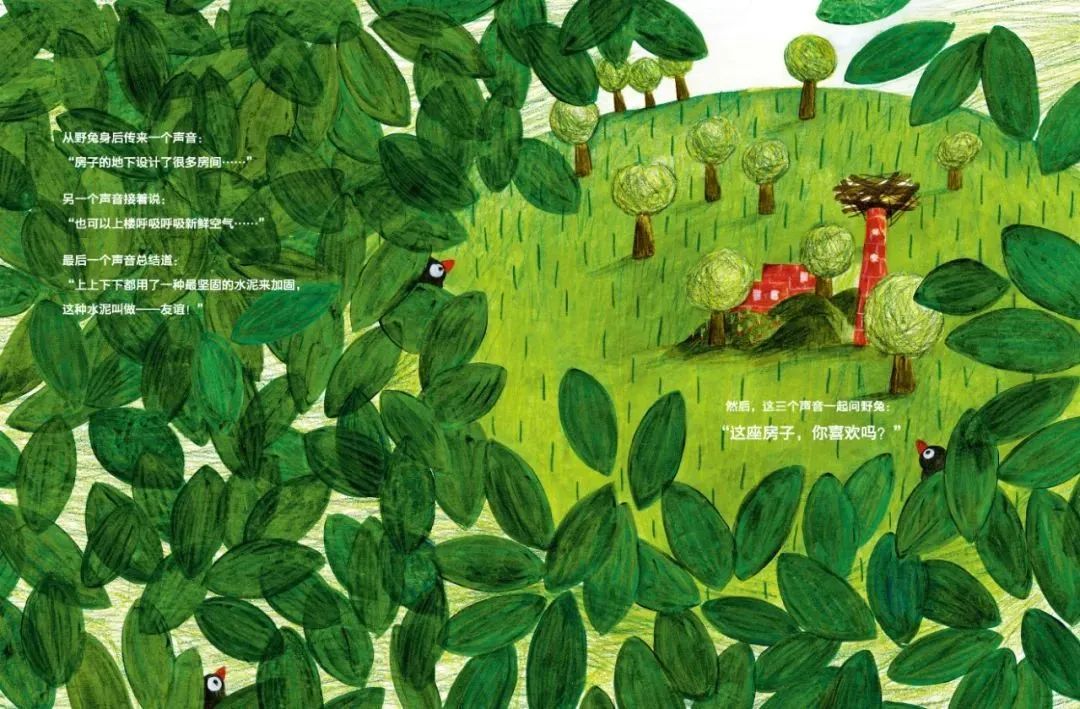 鼹鼠、鹳鸟、小猪给出的方案都不能完全符合小野兔的需要。晚上,它在草地上灰心丧气地睡着了。一觉醒来,它看到地上有一个箭头。好奇的它决定随着箭头去看一看……突然,它看见了什么呢?一个它梦想中的住房,原来朋友们这么忙,是在悄悄地为它盖一个大房子啊。