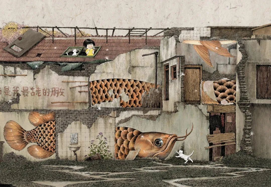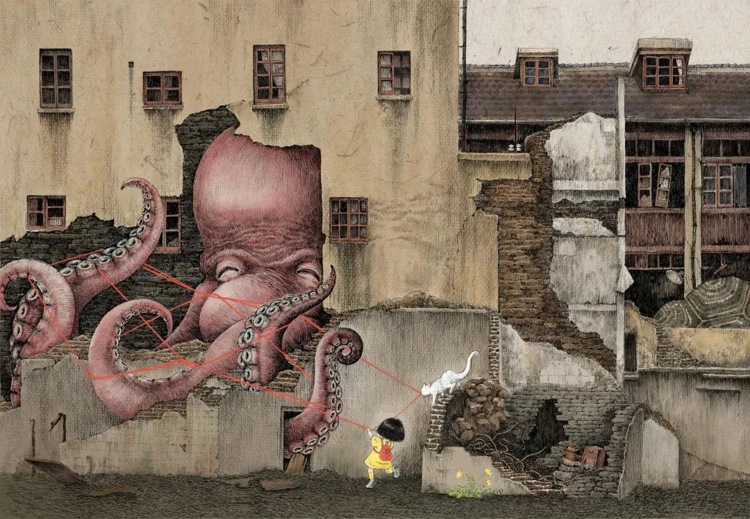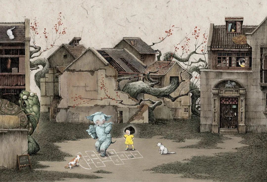 在即将拆迁的老城厢,不知怎么突然就冒出好多奇异的怪兽——巨型的章鱼、乌龟、金龙鱼悄然穿行其中,与小女孩一起跳房子、滚铁圈、红线翻花、躲猫猫......嬉戏童年。