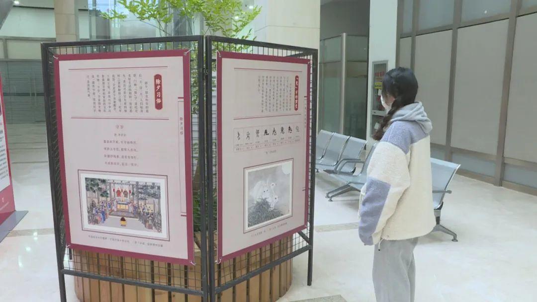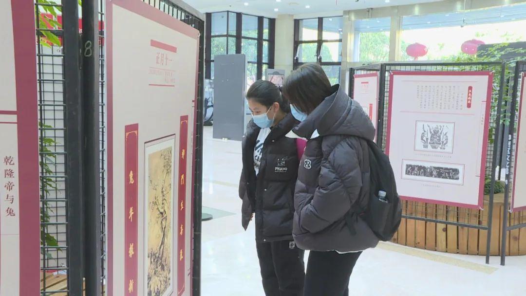 刚进大厅就能看到两只萌兔在通往二楼的长阶梯上欢迎着读者的到来。此次典籍文化展位于一楼大厅,在两侧展出了40幅与“兔”有关的经典展板,通过丰富的文字与古籍照片,集成故宫博物院、国家图书馆等多方藏品影像,以时间为轴,细数从小年至上元期间,典籍记录下的新年“兔”文化,展现书籍里的新年,让读者们都成了一名名“兔”专家。