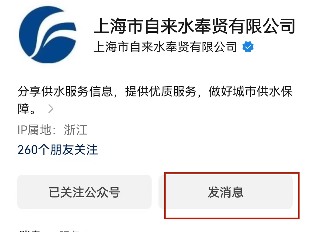 2.关注“上海市自来水奉贤有限公司”公众号,点击发消息;