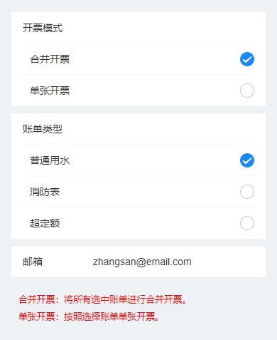 7.您可以根据需要选择合并开票或者单张开票,选择账单类型,同样也可以修改接收邮箱,确认无误后点击选择账单;