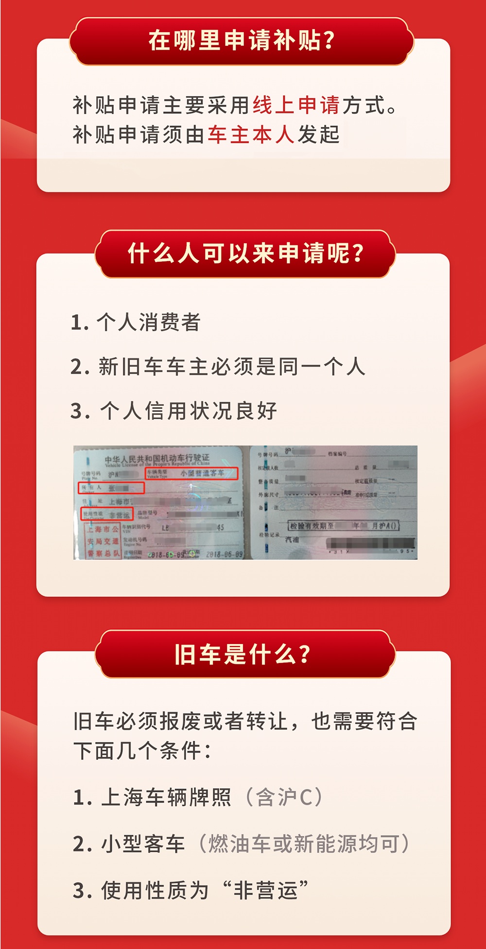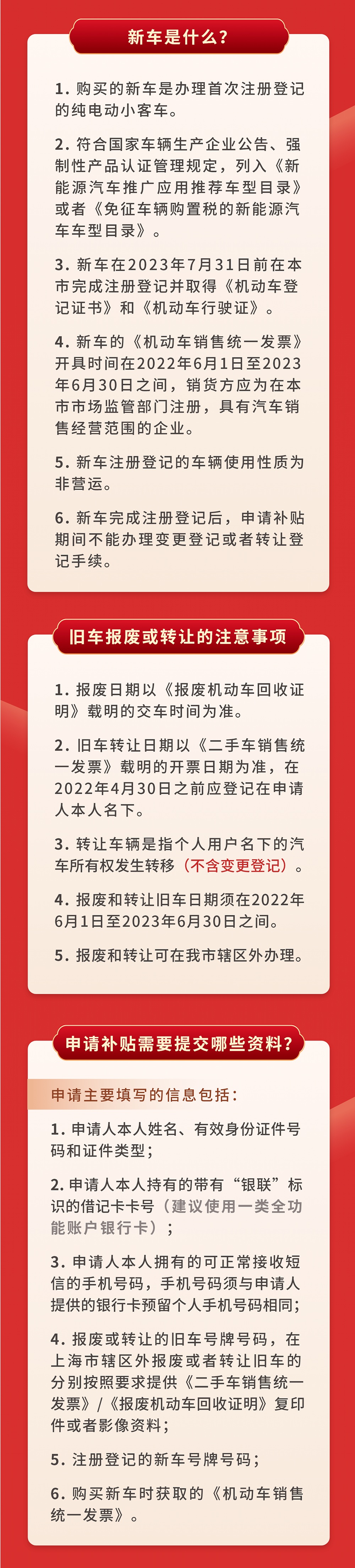 市发展改革委介绍,促进汽车消费补贴再延半年!2023年6月30日前,个人消费者报废或转出名下在上海市注册登记且符合相关标准的小客车,并购买纯电动汽车的,给予每辆车10000元的财政补贴。申请需要符合怎样的条件?需要提交哪些资料?详见↓