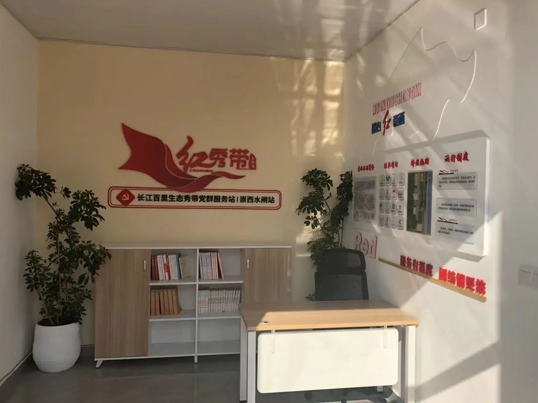 长江百里生态秀带党群服务站面积约42平方米,室内空间及墙面展板设计以水元素和党建元素为主题。结合“红秀带”的设计理念,服务站围绕“党群服务、爱心服务、综合服务”等内容,将免费提供咨询、休憩、学习等服务,拓展崇明海塘人“乐于奉献”的社会服务效能。