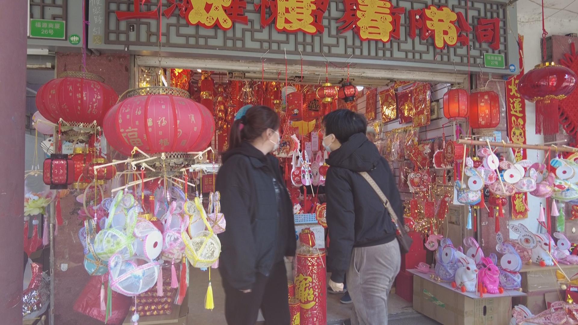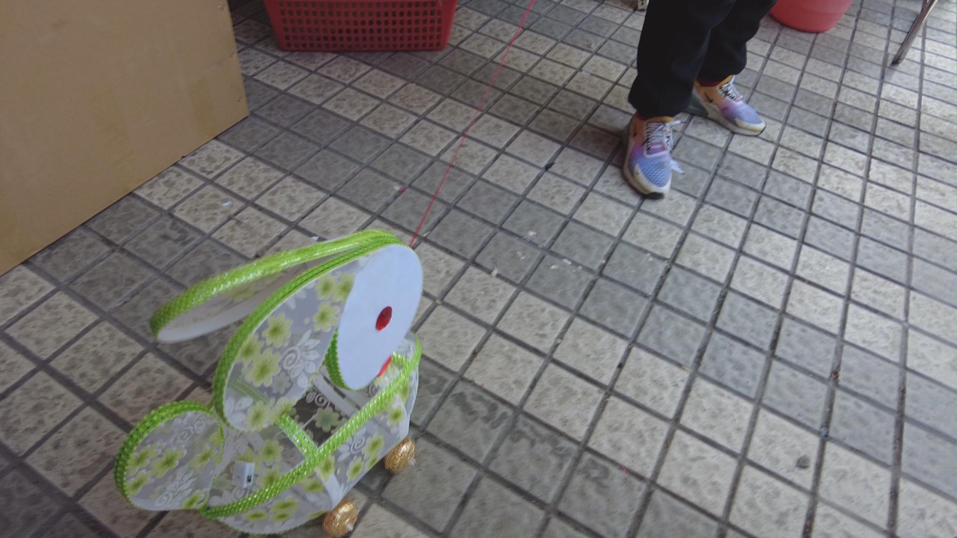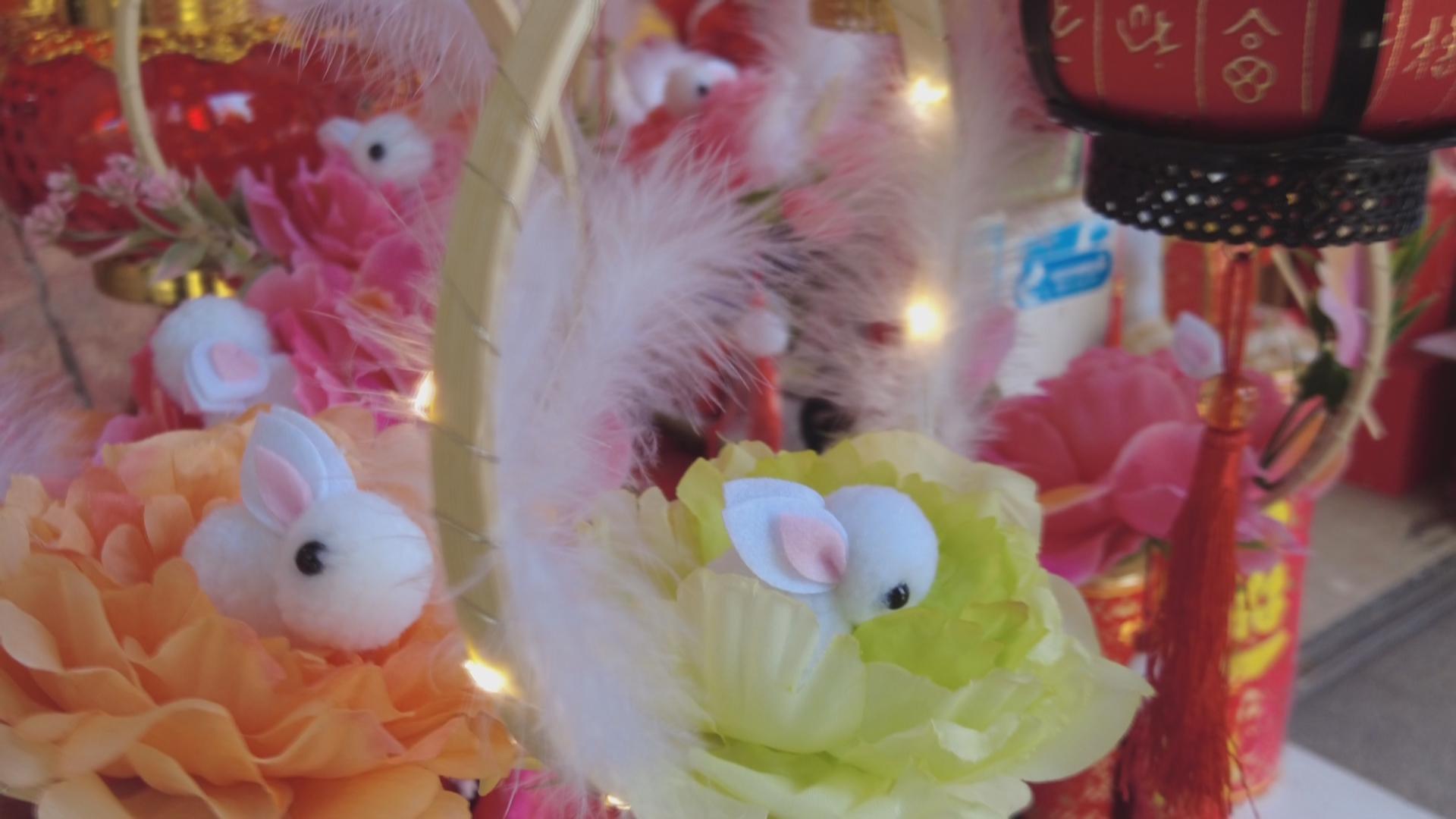 豫园商城里的兔子灯成了网红,而商城外,一些销售传统兔子灯的店家生意也同样红火,传统兔子灯的价格相对便宜,最便宜的纸质兔子灯只要几元钱,而普通大小的塑料兔子灯只要15元左右,灯体越大,价格就会相应升高。有店主介绍,今年店里卖得最好的一款兔子灯是这种布艺的兔子灯,造型模仿了手工兔子灯的传统造型,但整体使用了色彩、图案各异的布料制作而成,兔子的眼睛则是一大块“红宝石”,炯炯有神,小型的可以提在手上,大型的布兔子则安装上了四个轮子,可以牵着走。光是这种类型的布艺兔子灯,大大小小已经销售了近千个,趁着元宵节前还补了一次货。还有一种花环兔子灯,是今年新品兔子灯,一个小小的花环上,底部花团锦簇,里头还窝着一只迷你小白兔,充满诗情画意。