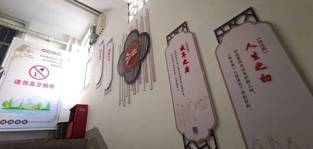 借助法律条文、法治格言、居民心声、民法典章节等区域设计,让法治宣传从单一的灌输式宣传教育方式向贴近群众、具有区域性法治文化特色的方式转变。