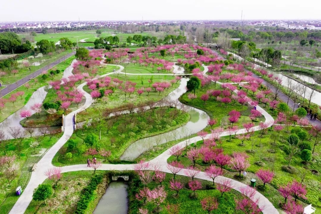 花开海上生态园现有梅花3万余株,梅园核心区植有精品梅树1万余株,涵盖宫粉、朱砂、绿萼、江梅、龙游、垂枝、杏梅、美人梅等八大类,早、中、晚,白、粉、红等60多个品种。