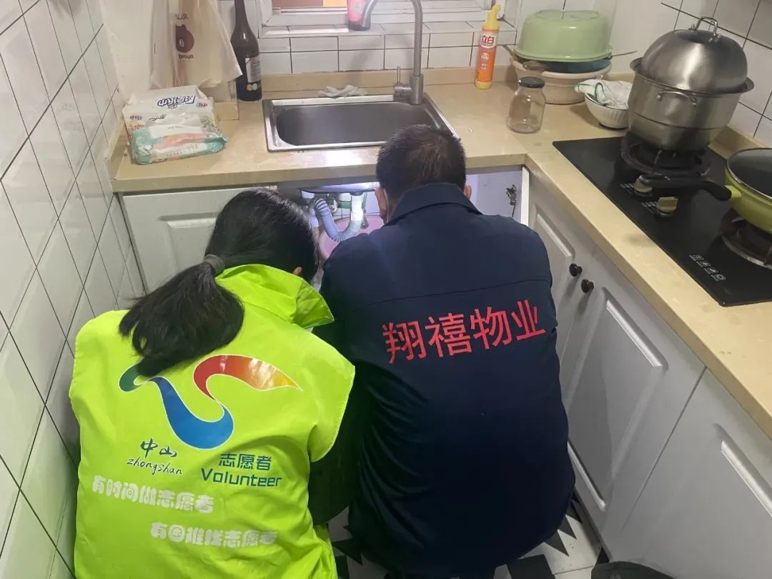 “阿姨您别急,我们立马就上门。”接到汪阿姨的电话后,小周协同社区工作者立即上门了解情况,来到汪阿姨家中,查看漏水情况,随即上楼与702室住户沟通。住户姬女士是一名“90后”,独自在此租住,她表示,之前不是不愿意配合解决,而是晚上不敢开门,她已经找了维修人员,正等着上门维修。她领着志愿者及社区工作者去厨房查看漏水管道情况。