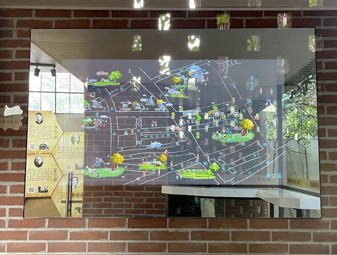 此次更新的一大亮点,在于新增了一个手触镜面数字大屏,镜面屏里有社区内50处历史建筑的文字介绍和音频解说。