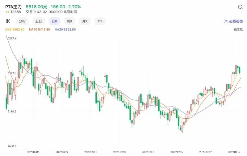 根据PTA(原油下游产品,生产PTE的主要原料)主力指数显示,去年1季度后,PTA主力打开上涨区间并于6月10日触及7728元的阶段性高位后回落,不过在去年12月起触及低位后反弹。2月2日15:00收盘报5618元跌2.7%,指数水平与2022年初价位相当。