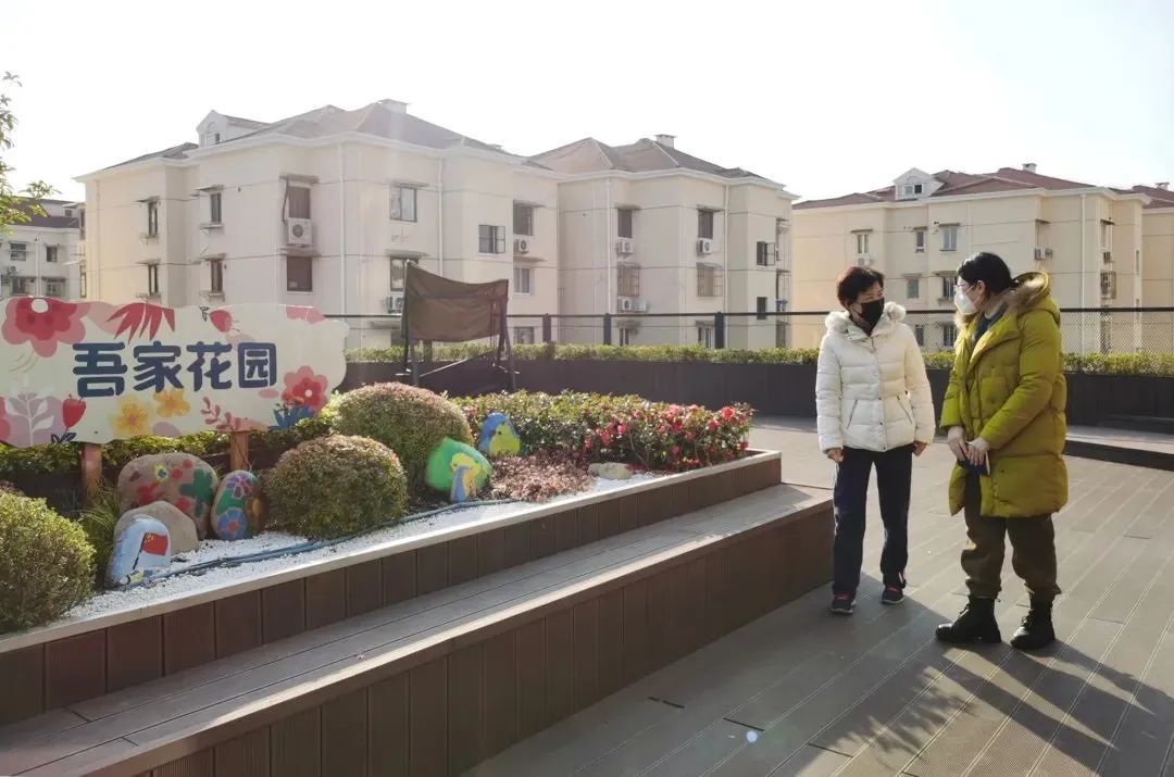 在三楼屋顶的“吾家菜园”,正在晒太阳的居民沈阿姨,起身与书记拉家常。作为新泾五村的老住户,沈阿姨是亲眼看着吾爱家建设起来的。她说,这里原来是一片空地平台,功能比较单一,还是露天场所。如今大变样,独栋三层的大空间能满足不同人的休闲需求,真的和家一样。