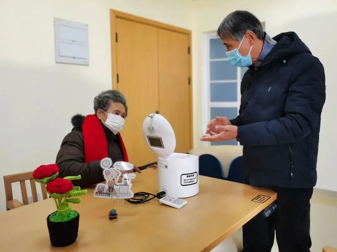 今年86岁的顾阿姨是爱馨苑的常客,在二楼的家庭无障碍体验区,老人认真聆听工作人员讲解智能提醒药盒的使用方法。“没想到吃药都有专门的机器,蛮有意思的。”