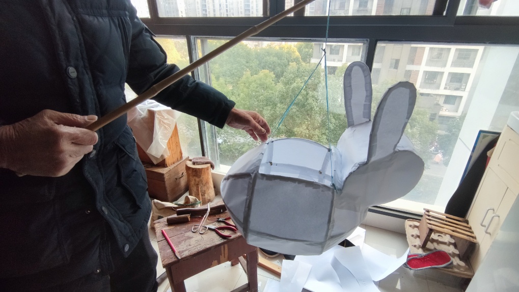 只见薛其华手拿竹刀,将新鲜的篾竹劈开,然后将竹篾剖成粗细均匀的篾条,再弯曲成圆,用扎丝捆扎成兔子的身体、脑袋、耳朵,这样兔子灯的框架就初步形成了。接着就是糊纸,由于每一块立面都必须单独裱糊,这就需要不停地调整角度,非常考验耐心。