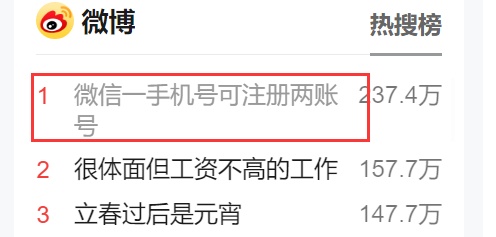 2月3日,国民级应用微信再出重磅功能:全量开放使用同一手机号注册辅助账号功能。当天中午,话题#微信一手机号可注册两账号#也登上微博热搜榜第一。
