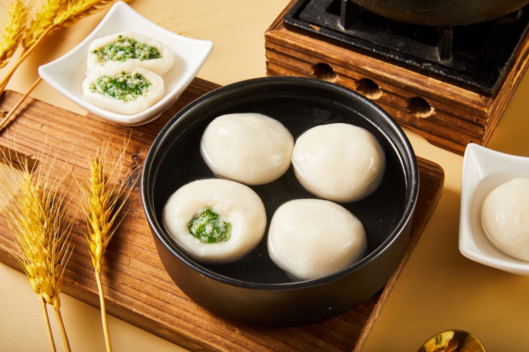 另一款“手工荠菜肉大汤圆”则选用了传统水磨糯米粉,特制出猪前腿肉和新鲜荠菜的7:3黄金比例,咸鲜清香。