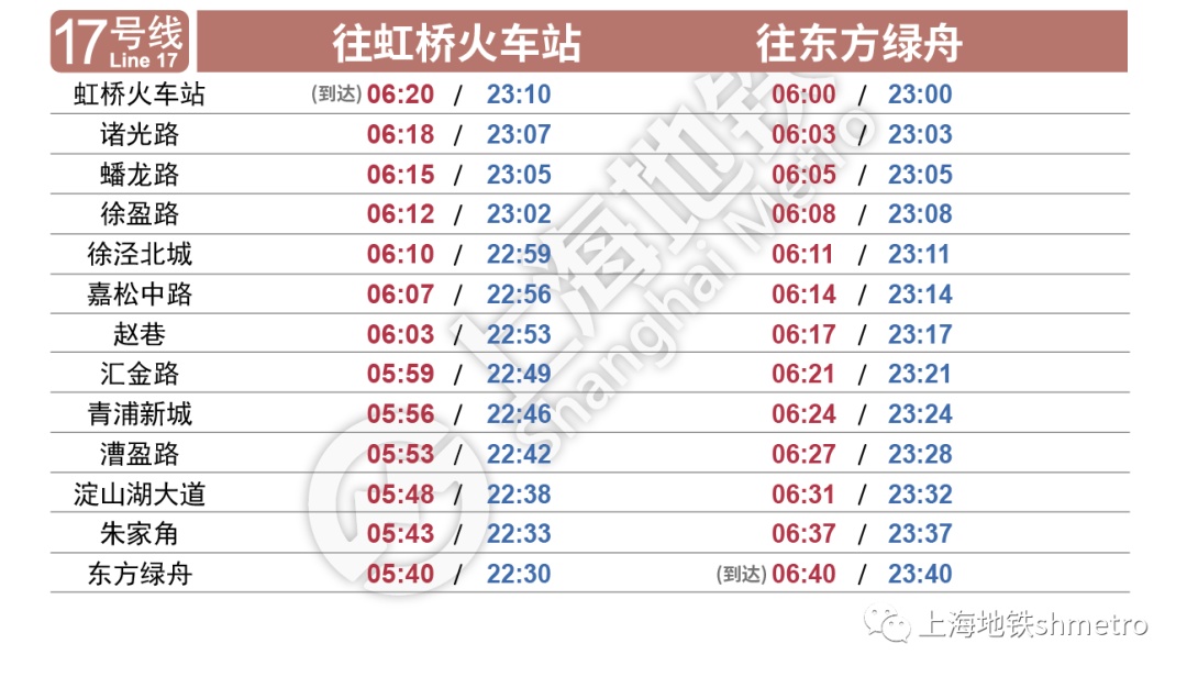返程旅客可选择乘坐地铁2、10、17号线离开虹桥火车站前往目的地,三条地铁线路的首末班车时刻表见下图,目前末班车以常态化运营(蓝字)为准。