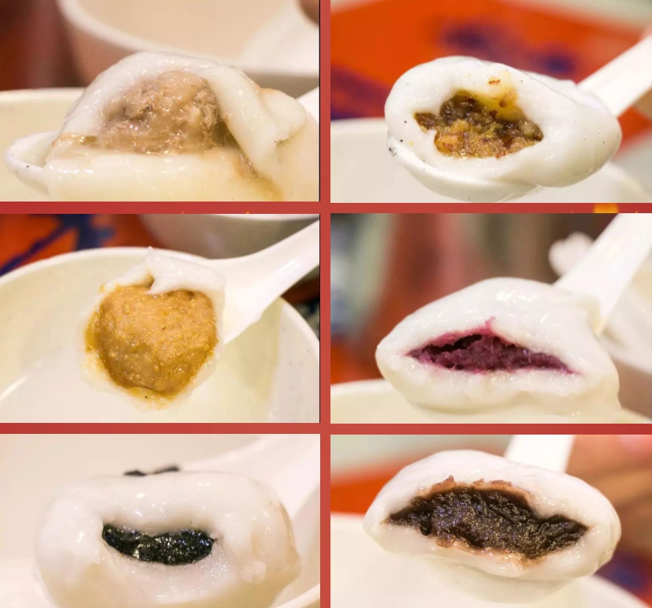 七宝老街汤团店曾获“上海名点”、“上海金牌小吃”等数个奖项,汤团有很多口味,门口木牌上清清楚楚标着汤团的口味和价格,鲜肉、蟹粉、荠菜、芝麻、豆沙、枣泥、花生等。不同汤团各有特色,鲜肉的汤汁醇厚,芝麻的香甜油润,荠菜肉的鲜美滑爽、枣泥的枣香酸糯……总有一款适合你。刚烧好的汤团,入口不粘牙,米香、豆香、芝麻香、肉香,香气四溢,令人垂涎。