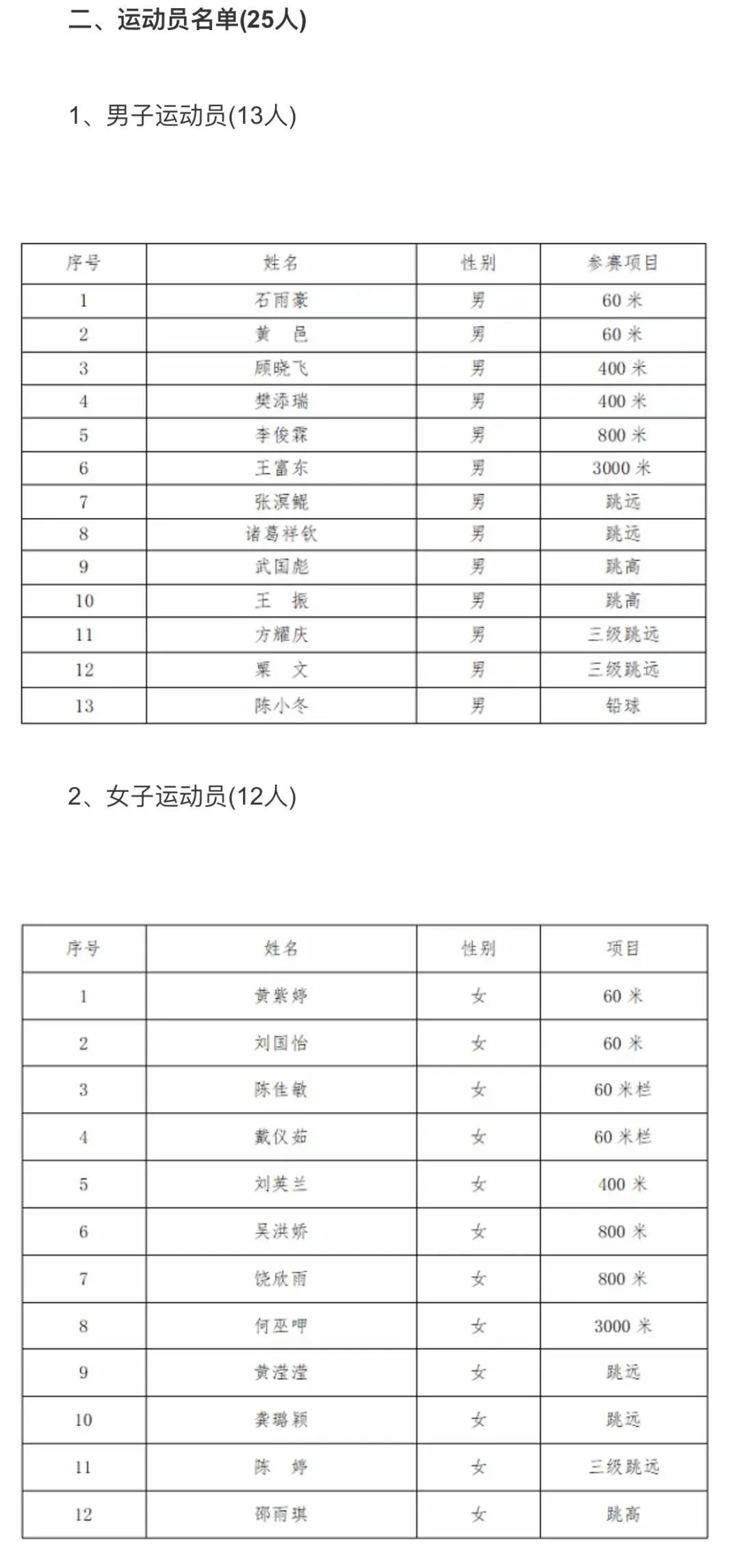 13名男运动员和12名女运动员中