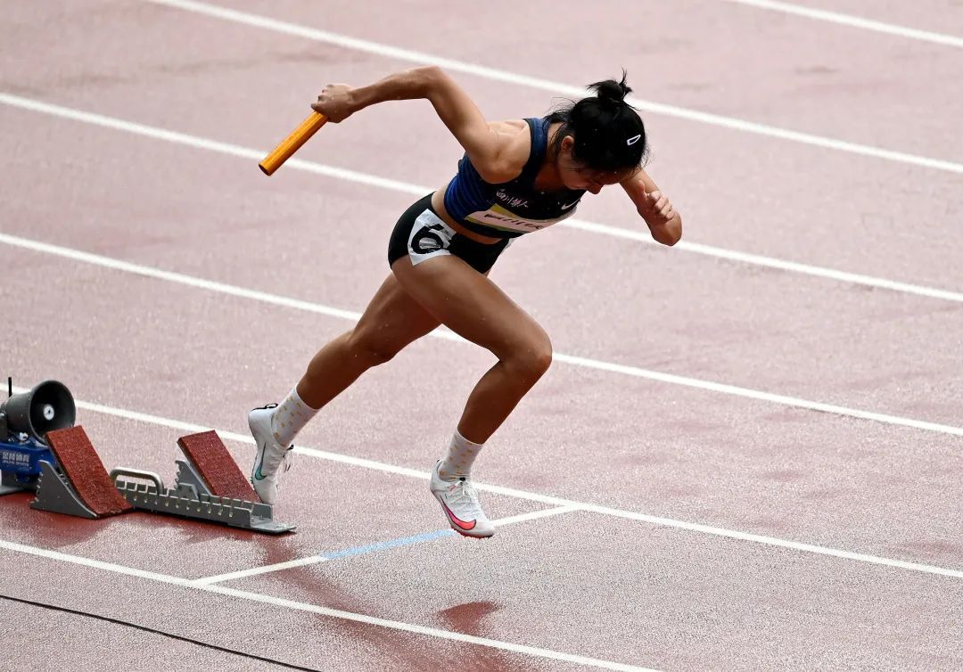 2021全运会田径4X400米混合接力决赛中,四川队刘英兰起跑