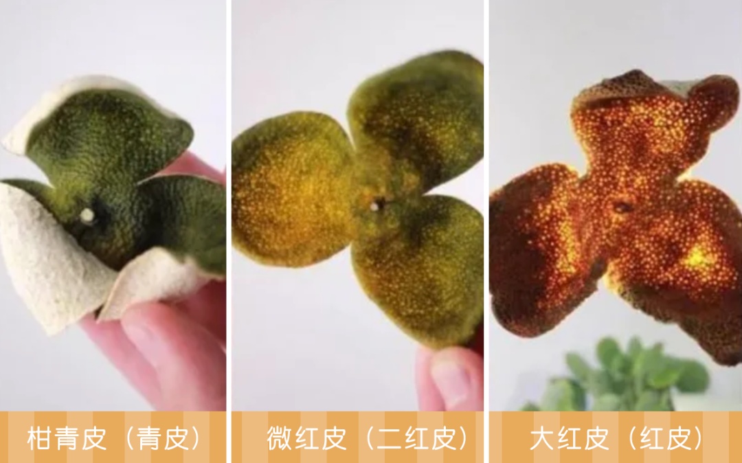 按采收加工时间,新会陈皮可分为:柑青皮(青皮),通常指农历立秋至霜降采收的果实皮;微红皮(二红皮),通常指农历霜降至小雪采收的果实皮;大红皮(红皮),通常指农历小雪后采收的果实皮。