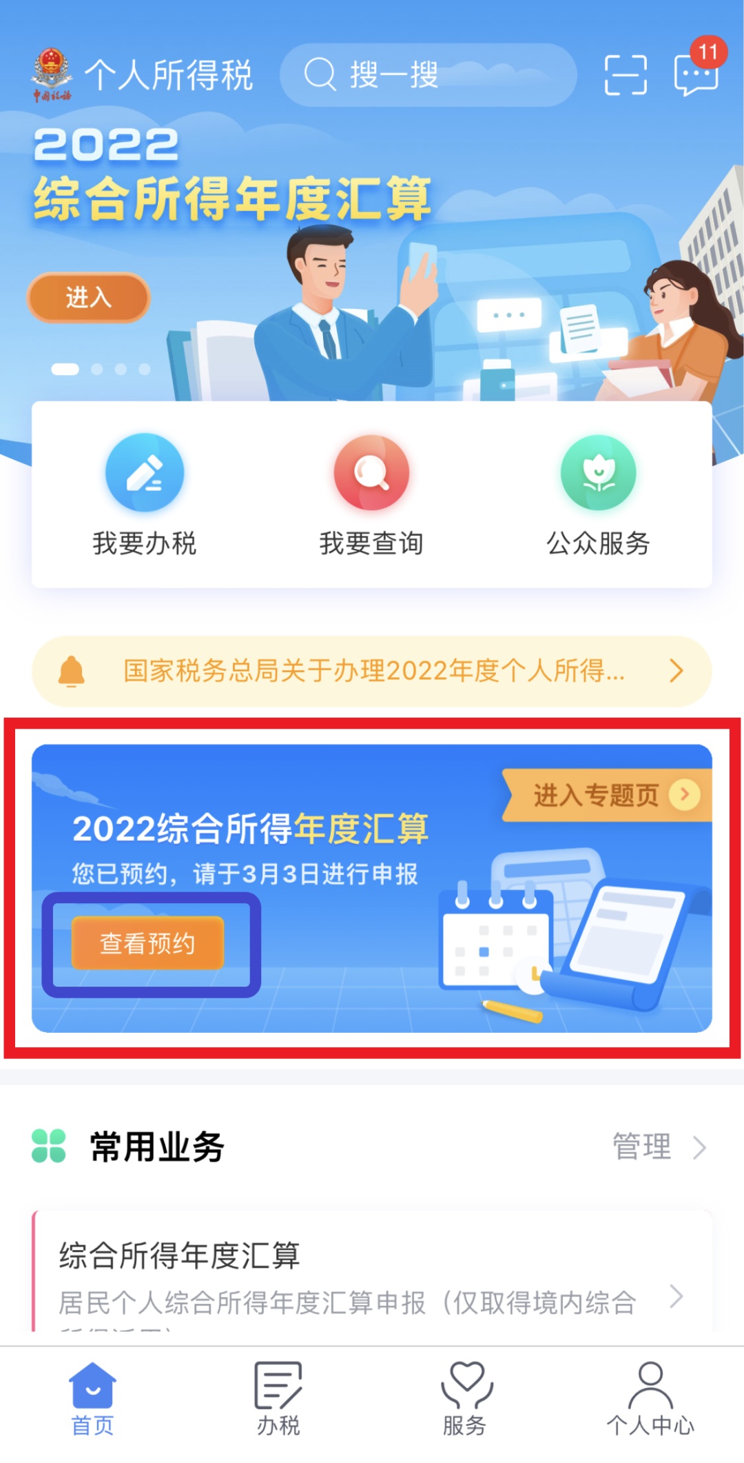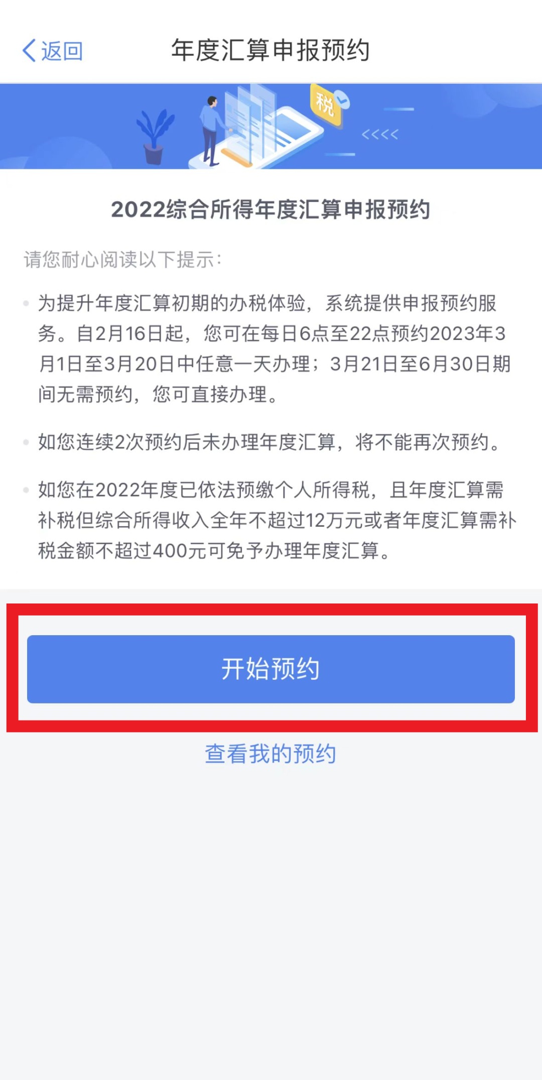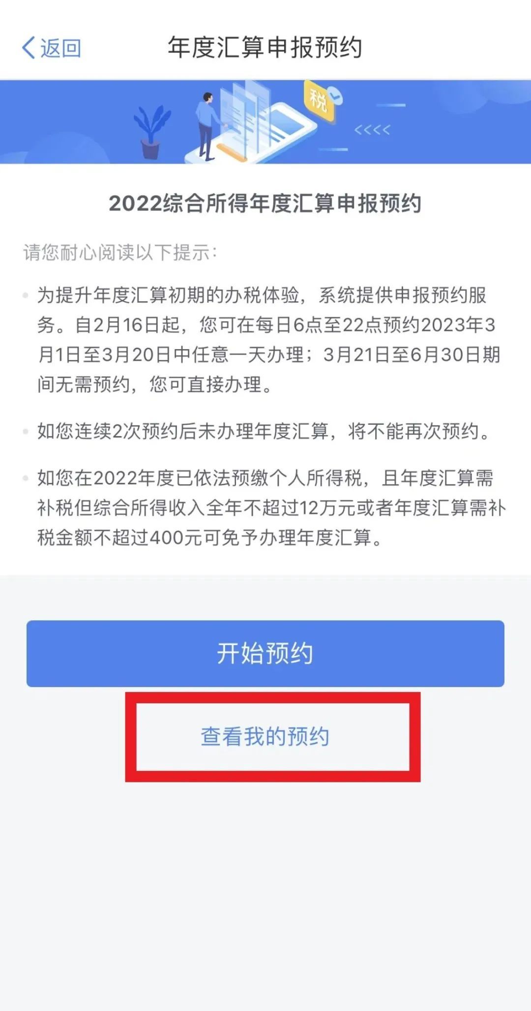 通过首页的【2022综合所得年度汇算】专题区域,点击【查看预约】,进入【我的预约】页面,您可查看到所预约的具体日期。