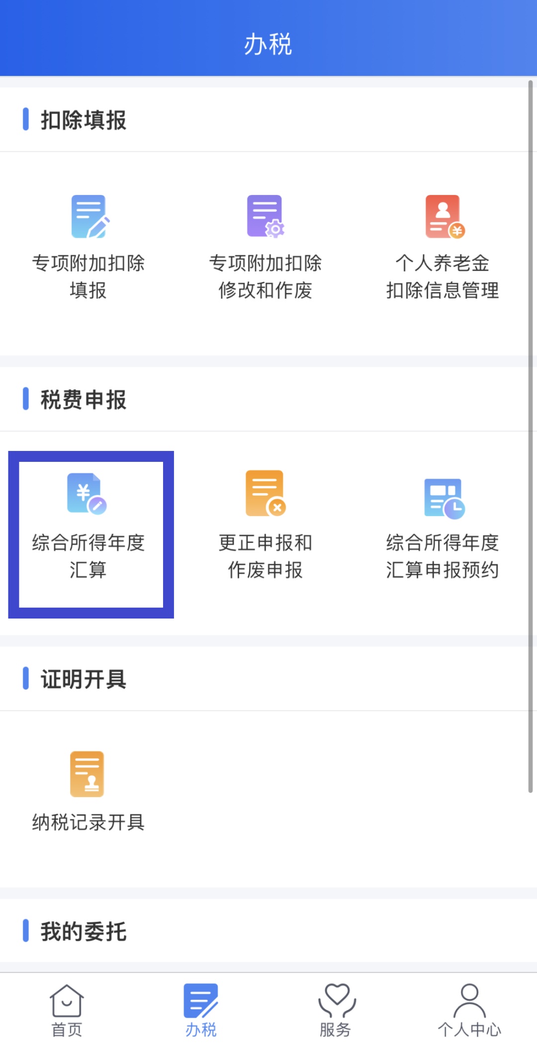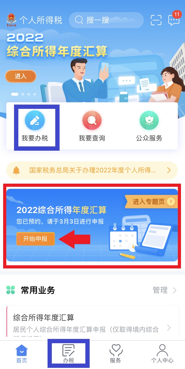 在所选日期当天,您可通过首页的【2022综合所得年度汇算】专题区域点击【开始申报】,或通过【我要办税】/【办税】—【综合所得年度汇算】发起申报。
