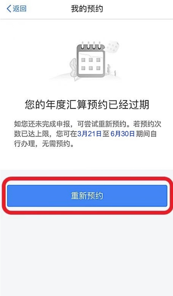 通过首页的【2022综合所得年度汇算】专题区域—【查看预约】,在【我的预约】页面,显示“您的年度汇算预约已经过期”,点击【重新预约】再次预约新的日期办理。
