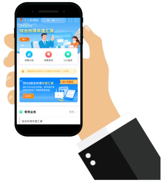 登录手机个人所得税APP(早6点至晚22点),在首页的【2022综合所得年度汇算】专题区域,点击【去预约】进入预约功能页面,也可以点击【我要办税】/【办税】—【综合所得年度汇算申报预约】进入预约功能界面。
