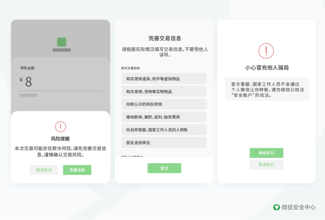据悉,对有可能发生风险的场景,微信系统会提前对用户进行安全提示。