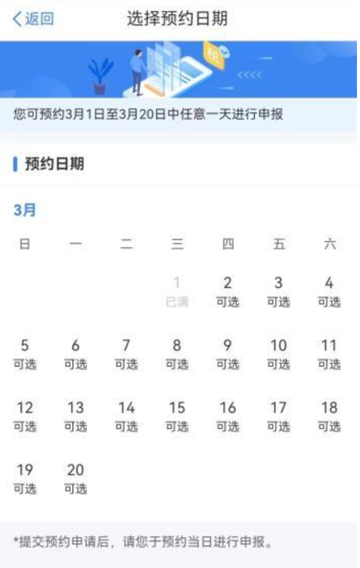 今年,税务部门继续推出预约办理服务,有汇算初期(3月1日至3月20日)办理需求的纳税人,可在2月16日后通过个人所得税APP及网站预约上述时间段中的任意一天办理。目前个人所得税APP显示,3月1日当天预约已满。3月2日-3月20日仍然可以预约。
