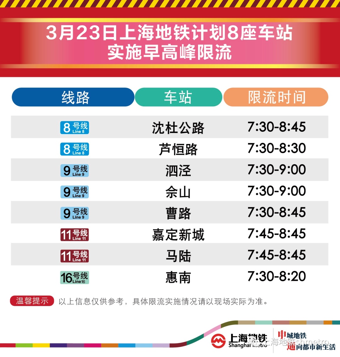 3月23日,上海地铁早高峰限流措施将继续实施,届时将有8座地铁站早高峰计划限流。