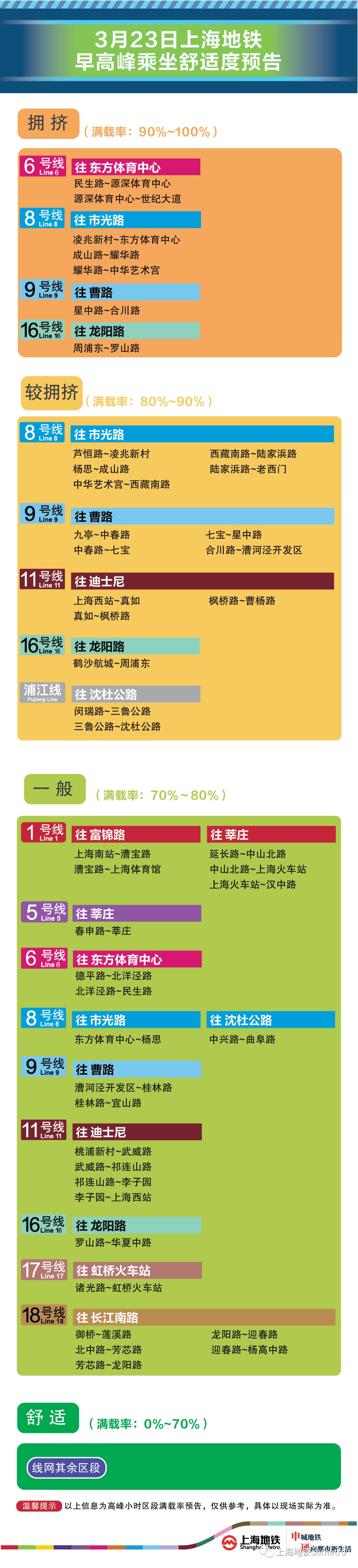 为提升上海地铁早高峰期间出行服务水平,提升乘客乘坐体验,上海地铁向乘客提供乘坐舒适度预告,方便乘客提前做好出行准备。