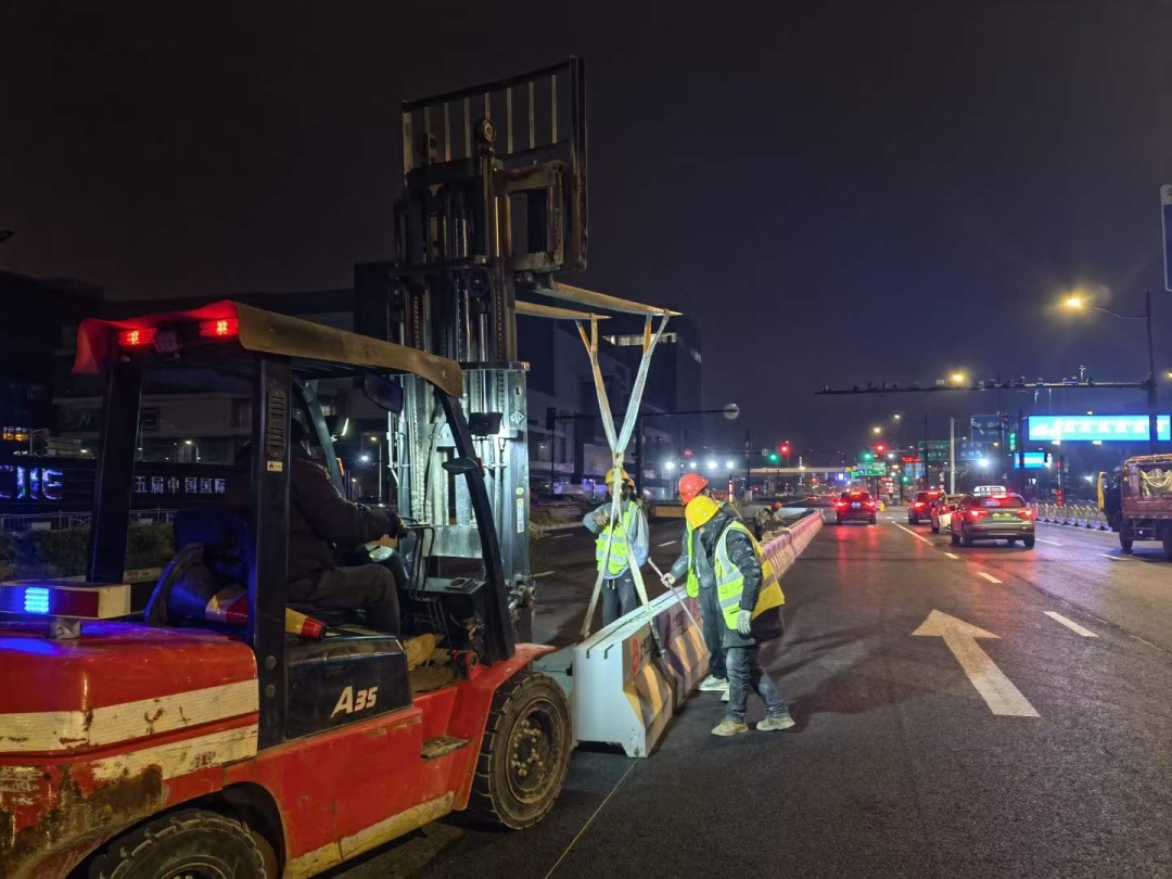 此次翻交自3月17日晚22时启动,并进行隔离墩、围挡的安装工作。在各方的协调配合下,相关配套单位道路划线、交通信号灯及设施搬运调试工作有条不紊开展。