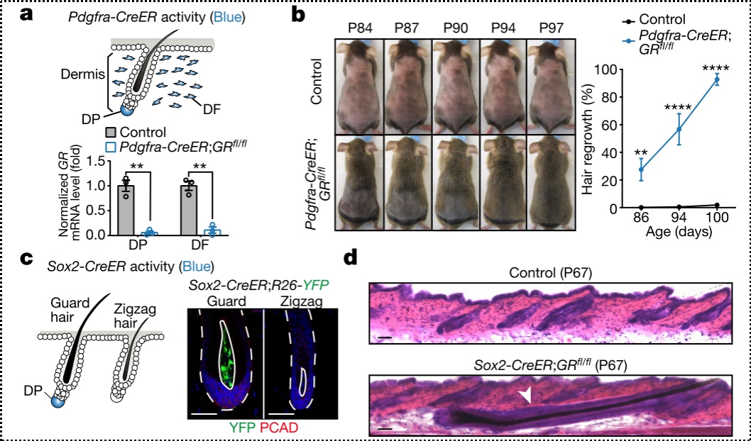 进一步,研究人员探究了皮质酮是否和小鼠的毛囊干细胞活性有关,结果的确如预期一样。