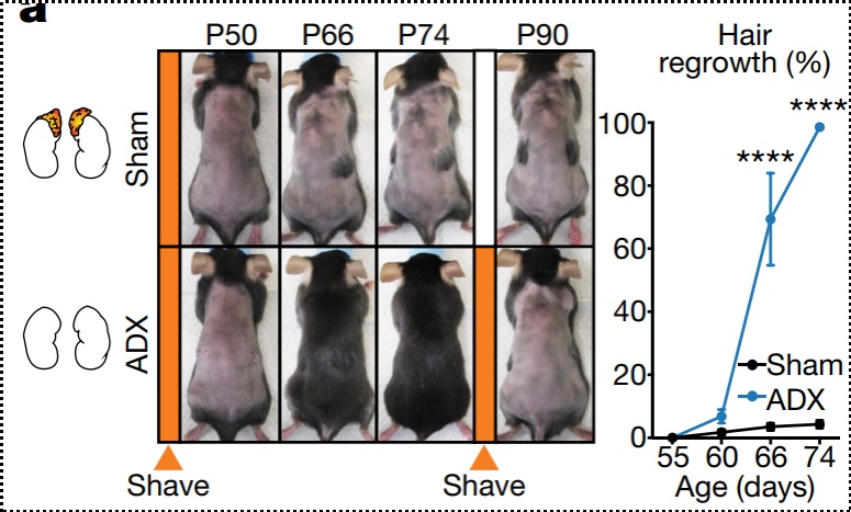 那么压力能否影响到毛囊干细胞的状态呢?于是他们决定以和压力密切相关的肾上腺作为研究对象。通过对比切除了肾上腺小鼠和假手术小鼠,结果发现,无论雌雄小鼠,当肾上腺被切除后都拥有更短的休止期,其毛囊干细胞活性增强,因此能够及时的恢复毛发。