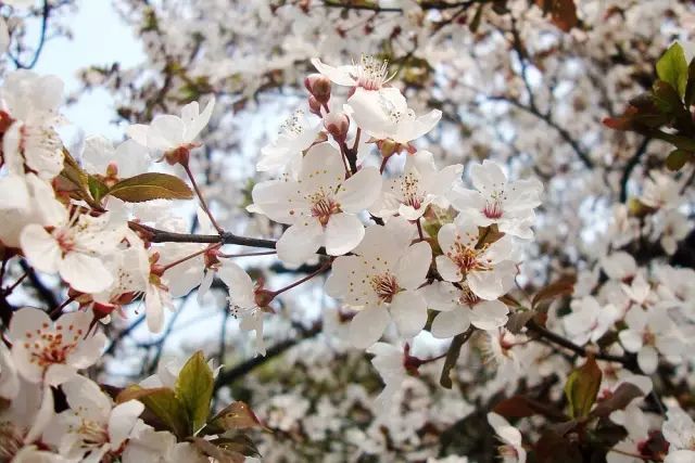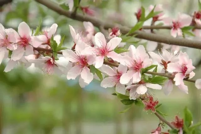 ● 如果花开的时候,叶子大多明显可见,可能是:桃花、西府海棠、垂丝海棠、紫叶李、梨花、晚樱。