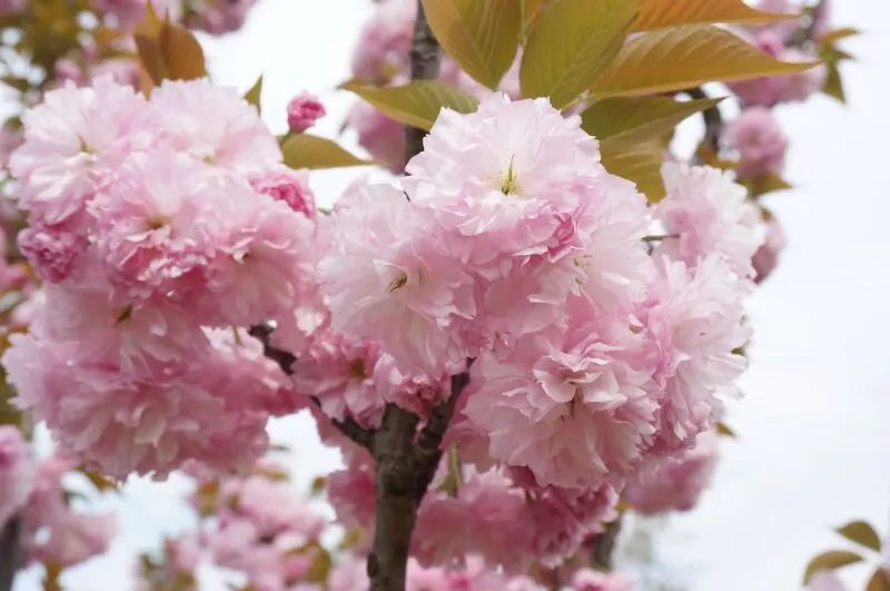关山樱,具有代表性的晚樱品种。在樱花中,晚樱品种开花最晚,一般在4月中下旬至5月上旬开放。花叶同出,常为重瓣花。品种繁多,除了粉色,还有白色、黄绿色等。