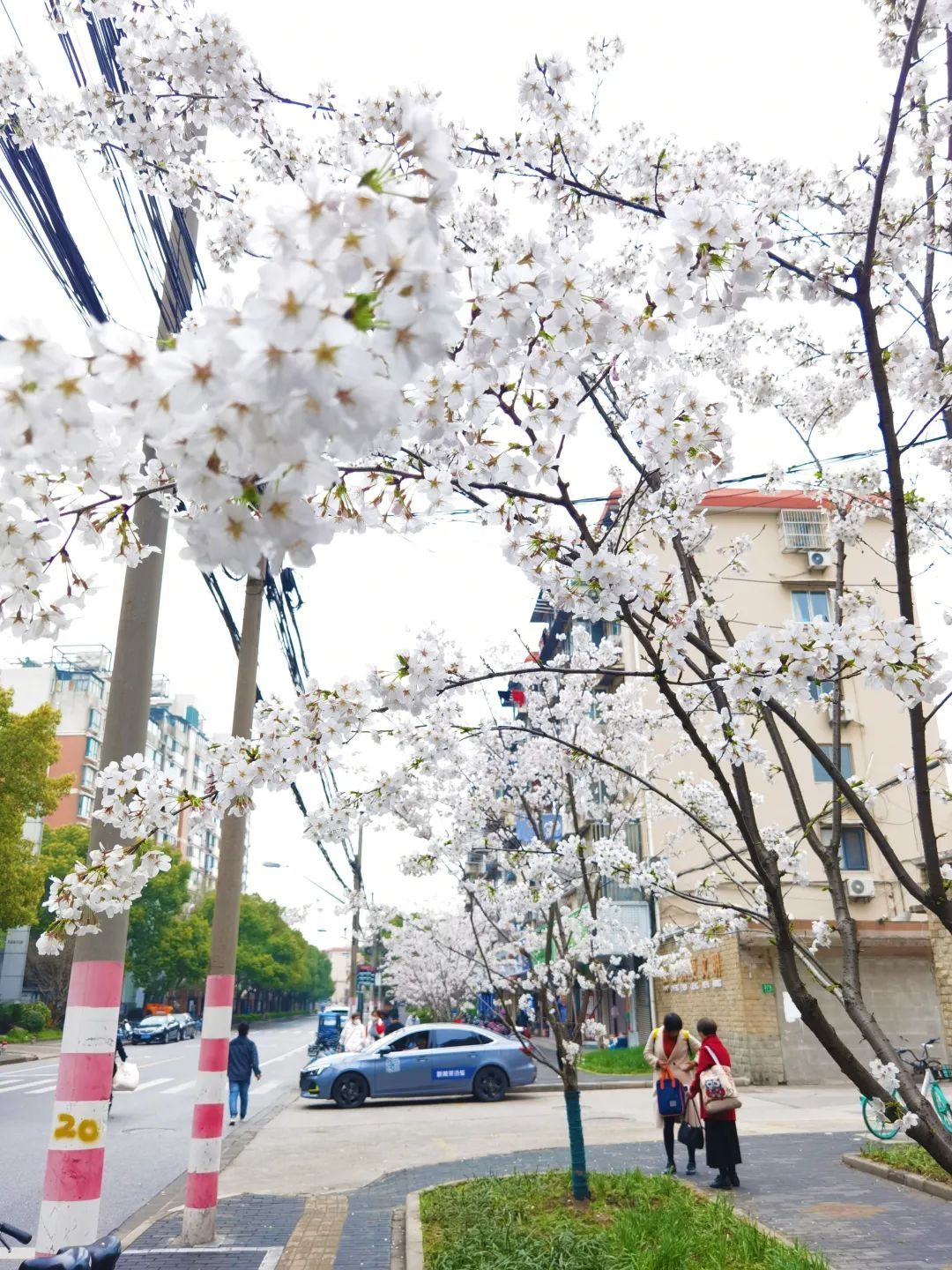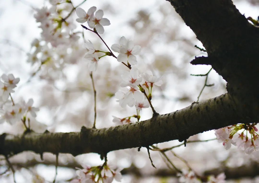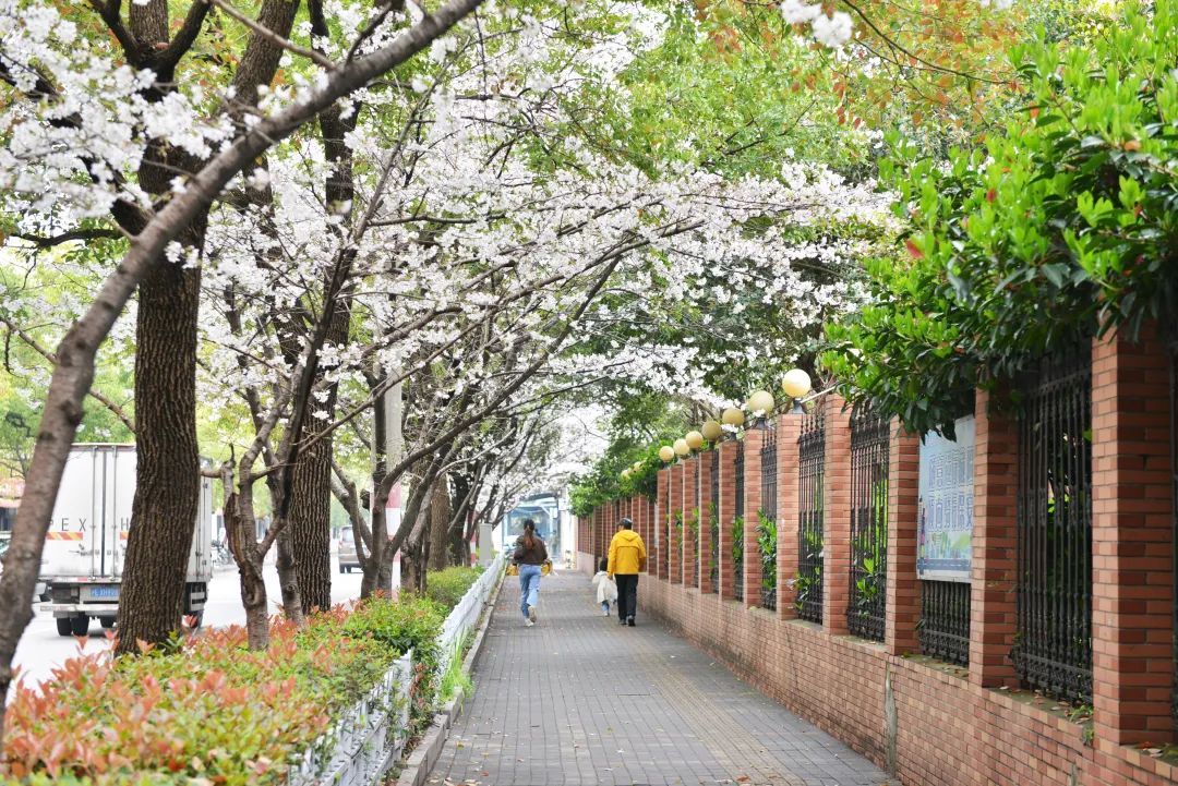 新二路的这段樱花大道长约500米,绽放的樱花盛大而茂密,开满了整条道路,仿佛飞雪在枝头连缀成片。前几日接连不断的降雨也没有削减樱花的丽色,一串串饱满的花朵在风中摇曳,不时有花瓣翩然飘落,渲染出一幅充满诗意的城市风景画。