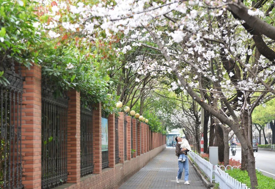 相比游人聚集的公园,不少居民觉得路边赏樱更加方便、轻松。市民范女士说:“出门就可以看到樱花,感觉非常好,有空了带孩子出来看看,拍拍照片都挺好的。”